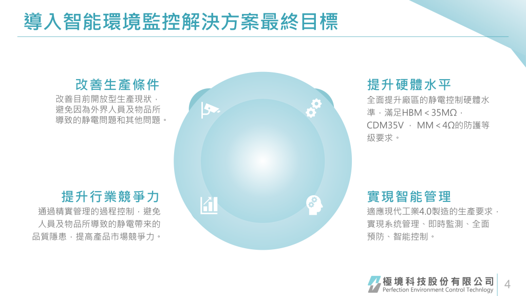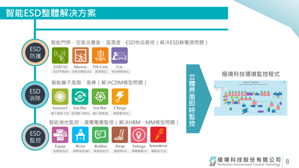 極境科技股份有限公司,立志於做出全球最出色的靜電防護與智能環境監控系統的研發、製造和服務商,研發出的連網智能靜電監控系統為全球首創;協助各種製造業使用系統化解決靜電損害,全面提升產品品質,在未來工業4.0的各種智能工廠中,提供數位化、訊息化的高品質環境管理。極境科技產品包含:靜電檢測、消除、監控和防護產品;靜電防護工程的設計、升級、改造與安裝;靜電防護的諮詢和服務;廠房環境的監控、焊錫工具、工業工具、智能溫溼度系統等等….